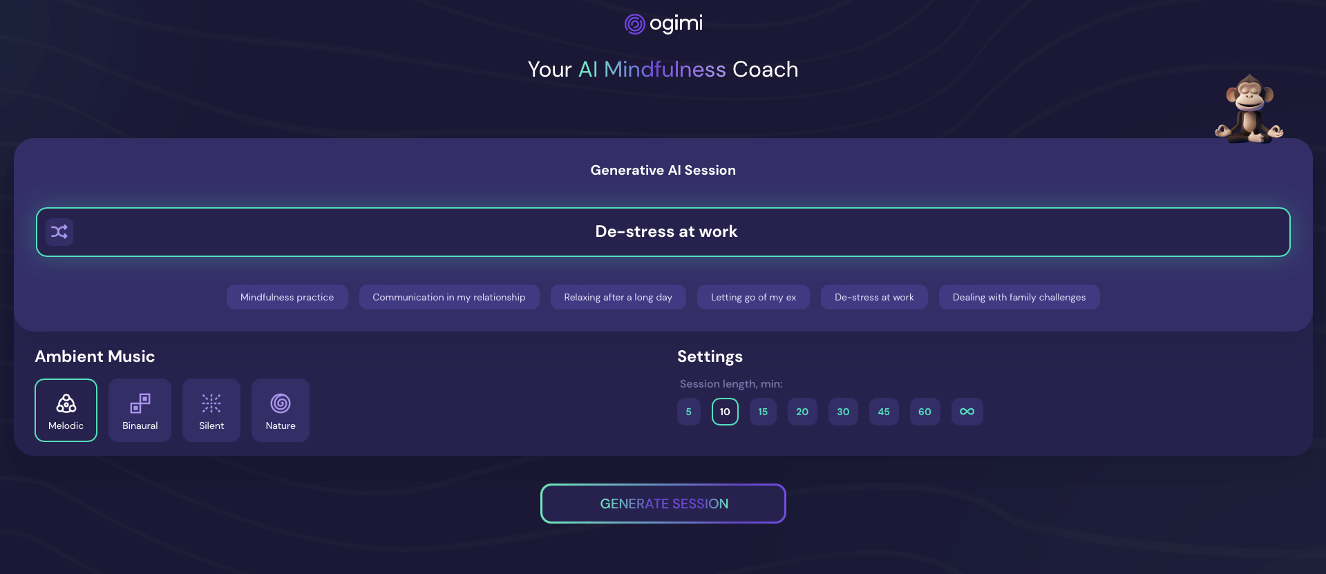 Ogimi generates personalized meditation sessions based on users’ preferences of music, objective, and time available.