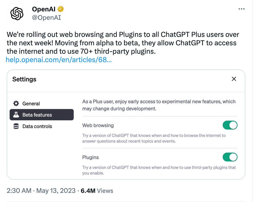 OpenAI launches the ChatGPT app for iOS in the US, adds a “Continue generating” button, and releases plugins for all Plus subscribers [link]