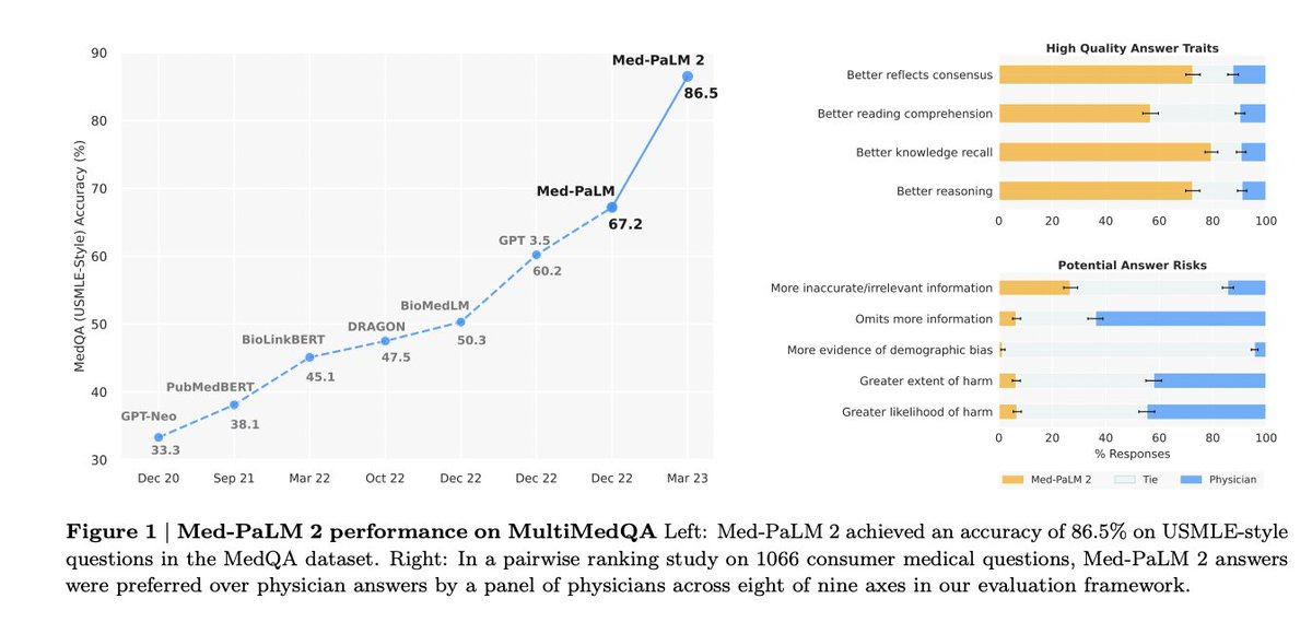 Read the excerpt here [link]MedPaLM-2 outperforms physician "experts" on medical knowledge answers- scores more than 86%